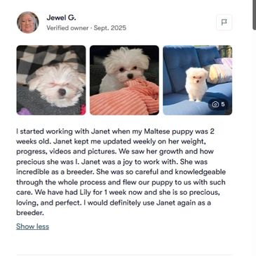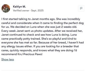 We had the BEST experience with Jan at KNJ Precious Paws. She was very organized and kept us informed with weekly updates until the day we received our little Walker! You can tell she really cares about all her fur families and we have the most precious healthy little guy to prove it. We are so grateful to her Carna. B.